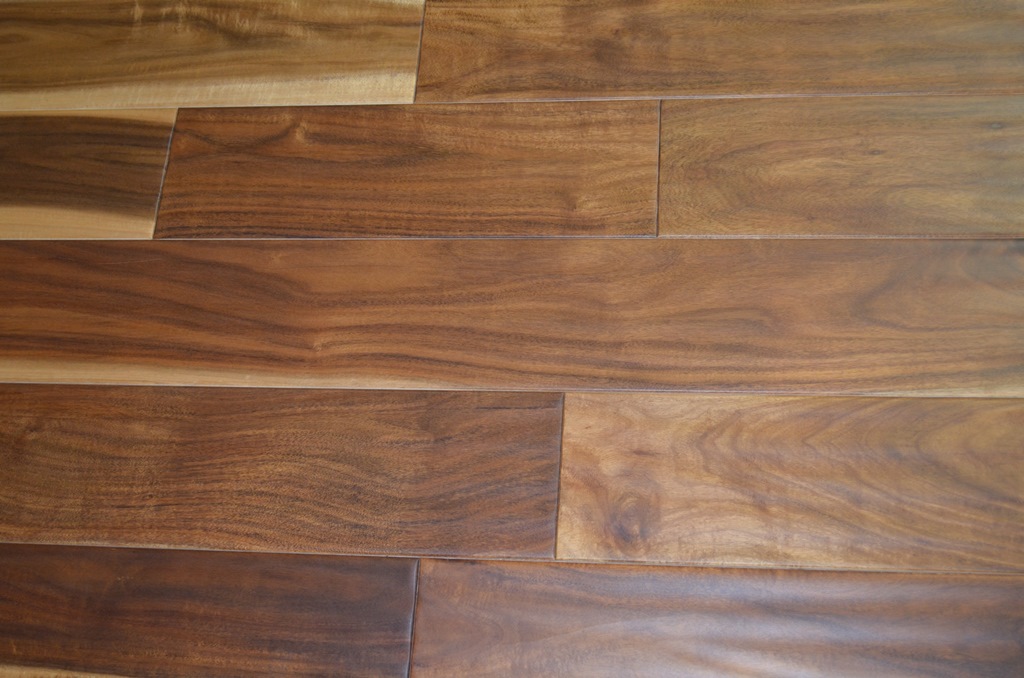 Acacia hardwood has a beautiful variation in its natural color with blonds, golds, and chocolate browns. The grain has a large swooping pattern and has a similar effect to Tigerwood but with a gentler curve to the grain. And when a stain is used the grain evens out. This is a hardwood you can dress up as well as dress down very easily. Acacia is also a very dense and durable hardwood. For those who love the look of hardwood and want a classy richness, this is wonderful hardwood to consider.